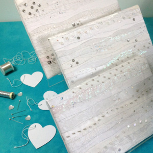I am just getting ready to exhibit at my first wedding fair at Heatherden Hall and thinking about how to present my range.  My wedding cloths have been rolled into scrolls ready to customise and I’ve hung these little chiffon and organza message hearts on a Wishing Tree.  They seem to look more like gift tags but I think that’s no bad thing.  Oh well !!!