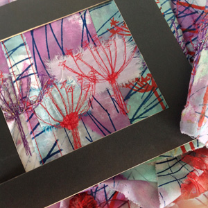 A while ago I made a floral hanging from scraps of dyed fabrics overprinted and accentuated with hand stitch. Not surprisingly a little turquoise snuck in! Now I think it’s time to up-cycle. Shall I make some little book covers, or maybe some greetings cards? Which to do? Perhaps some of each…