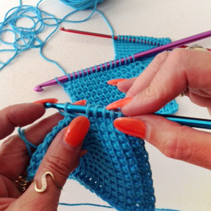 As a break from sewing I’ve been teaching myself how to do Tunisian crochet so practising in my favourite colour is a joy – and, fancy, one of the hooks is turquoise, too!