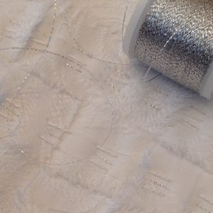 Now adding some trims to a woven cloth: vintage sheer ribbon and perlé cotton. Some rows of sparkly thread gives a subtle twinkle but beads and sequins will be added before it’s finally finished.