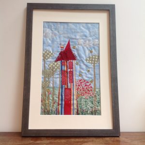 I’m wholeheartedly into repurposing clothes and if items are not fit for the charity shop I cut them up for my projects. This New Home picture is made from scraps in my bottomless box of snippets.