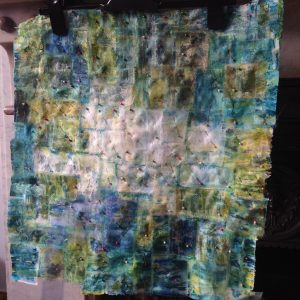 I’ve been working on a cloth made from mono-printed fabrics but inspiration has proved elusive! In the meanwhile I keep adding to it, waiting for a brain-wave…