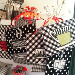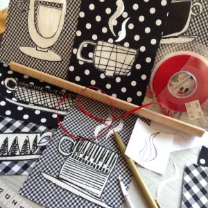 I found a fabulous piece of tablecloth remnant covered in amazing coffee cups which I appliquéd to some jazzy fabrics.