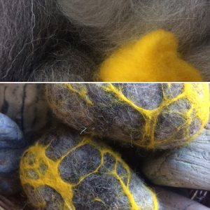 Looking through my stash of wool roving I thought I’d try out a mix of greys and yellow.  The combination turned out much better than I hoped and I have to say I really like it.  So now there are no more excuses for not being adventurous!