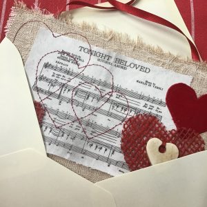 A friend asked me to make a Valentine card for her husband; quite an easy task as I know he’s a bit of a romantic! I found a vintage song sheet, some silk furnishing fabric, ragged muslin, a snippet of painted hessian, a roll of red cotton velvet and got to work. I hope he likes the result and appreciates the sentiment ❤️