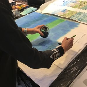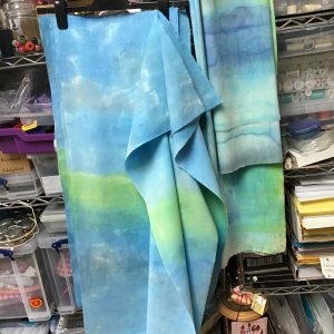 on painting the background.  To maximise its usefulness I used a threadbare linen sheet and while it was still damp tore it into specific sized pieces.  I layered them one upon the other and generously painted on the colour encouraging it to seep through the multiple layers giving me several backgrounds for future wallhangings and projects.