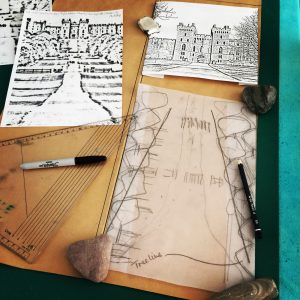 for a new Windsor Castle wallhanging – this time with a view from the Long Walk.  I try, as much as possible, to use pre-loved fabrics and the background for this project is entering its 3rd lease of life.  It started out as an Irish linen bedsheet and as it became threadbare was used as an ironing board cover.  For its last journey I have torn it to size and it’s now ready to paint.