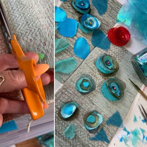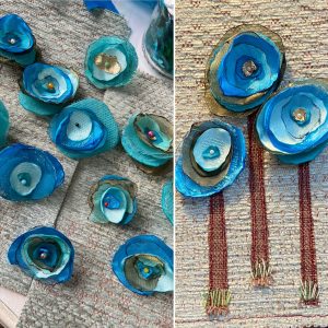 My little snippets of varying blue fabrics have been assembled into dainty blooms. The finished item is a little hanging ‘card-to-keep. It’s a pleasure to be given carte blanche when designing and delightful to hear that the item has been well received!