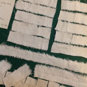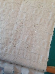 By weaving my latest wedding book I’ve collected lots of little bits of left over torn fabric. Rather than throw them out I’m piecing everything together to make several little cloths or, if I have enough, one big one. It’s exciting to see where this project will lead…